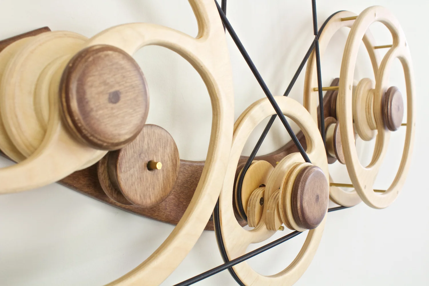 The result of combining a classic wheel with a recent mechanism design is Déjà Vu, a large sculpture that runs for more than 2 days. The intricate 15 spoked wheels rotate slowly primarily in the opposite direction. There is a shifting of speeds resulting in patterns that seem to have a slow pulse. This optical pattern continues to mesmerize viewers and never grows old. This sculpture has two winding mechanisms and makes slight wood on wood clicking sounds.