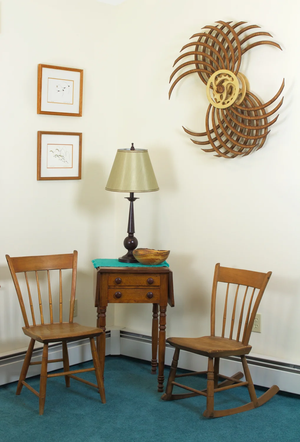 The mechanism was the next challenge. It worked and generated the patterns I wanted but not often enough or slowly enough. I kept fiddling but the answer came only when I noticed one of the prototypes misbehaving. Occasionally the mechanism would fail to catch a cog tooth soon enough and give double the push. I first figured out what was wrong and then found a way to make it happen at regular intervals. At last I had a pattern that was both dynamic and peaceful.