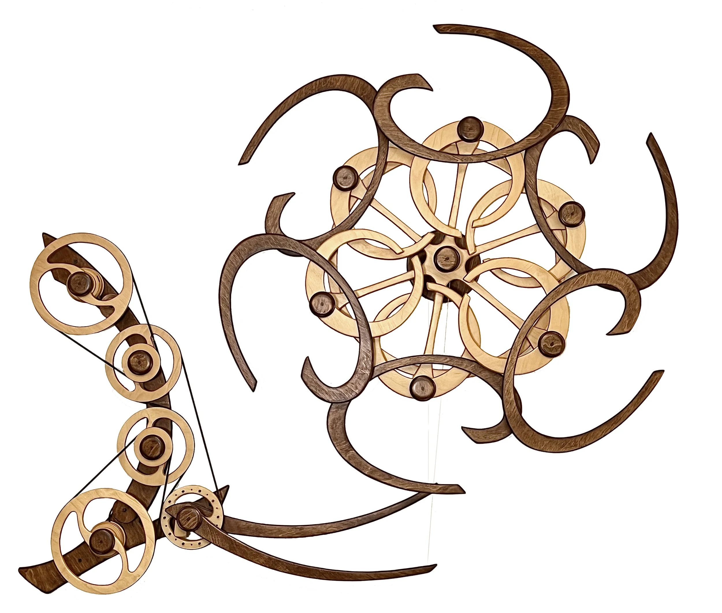 A quark is a hypothetical elementary subatomic particle. This sculpture reminded us of the order and chaos of the atom, hence the name. Quark Cotillion is the next generation of the motion and mechanism I first explored with my sculpture Rhapsody. I have used a series of six combination wheels to create a more complex and kaleidoscopic motion.