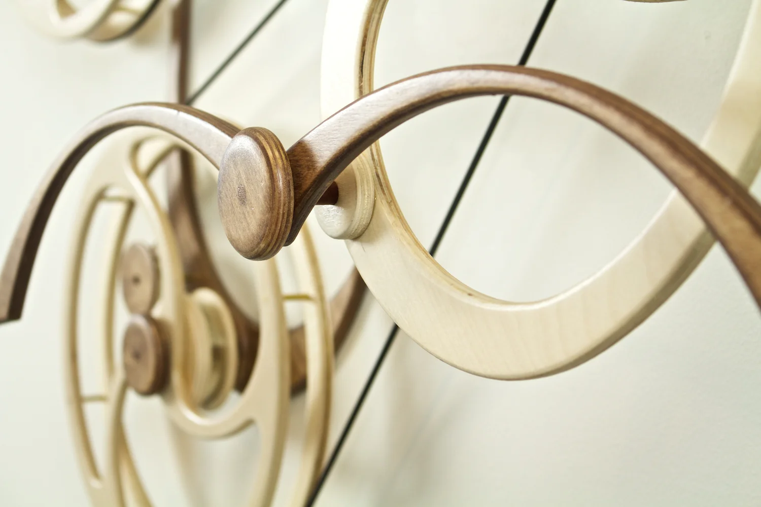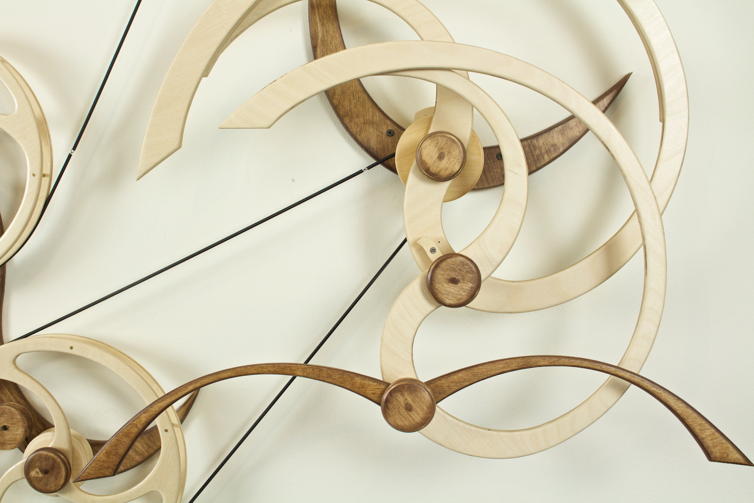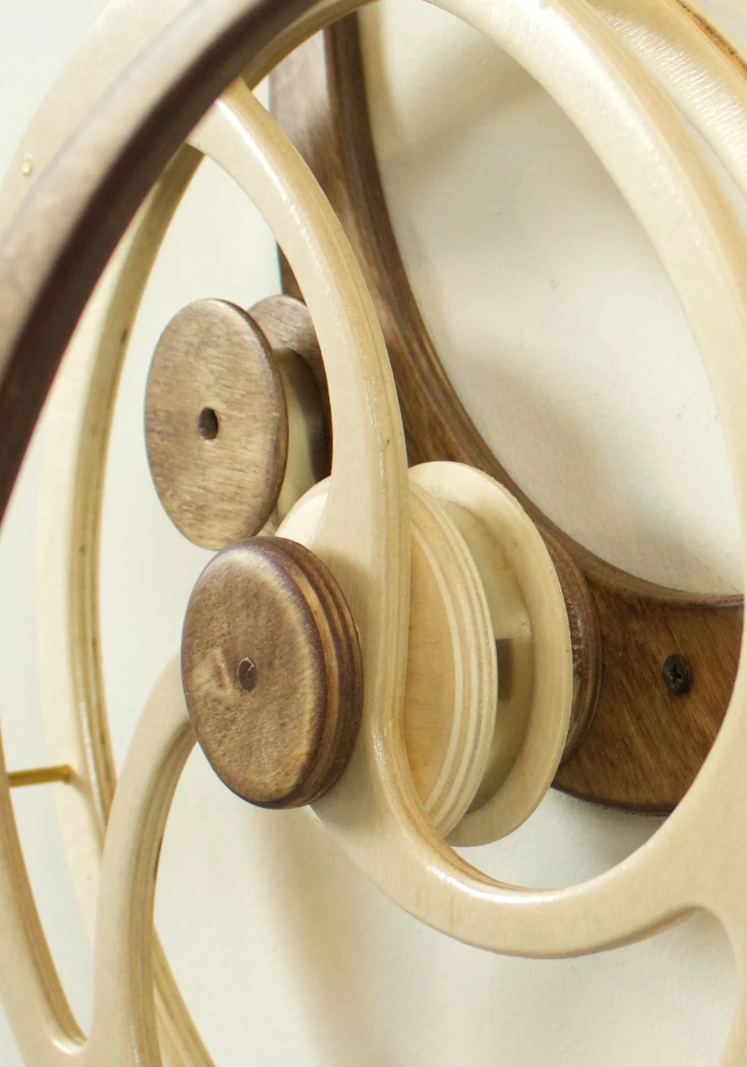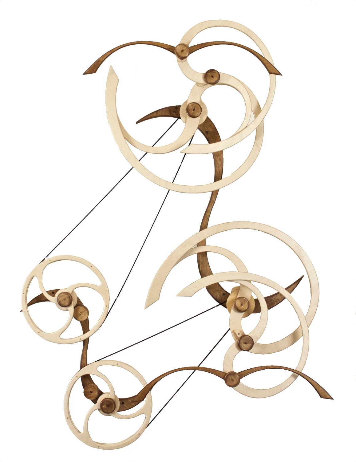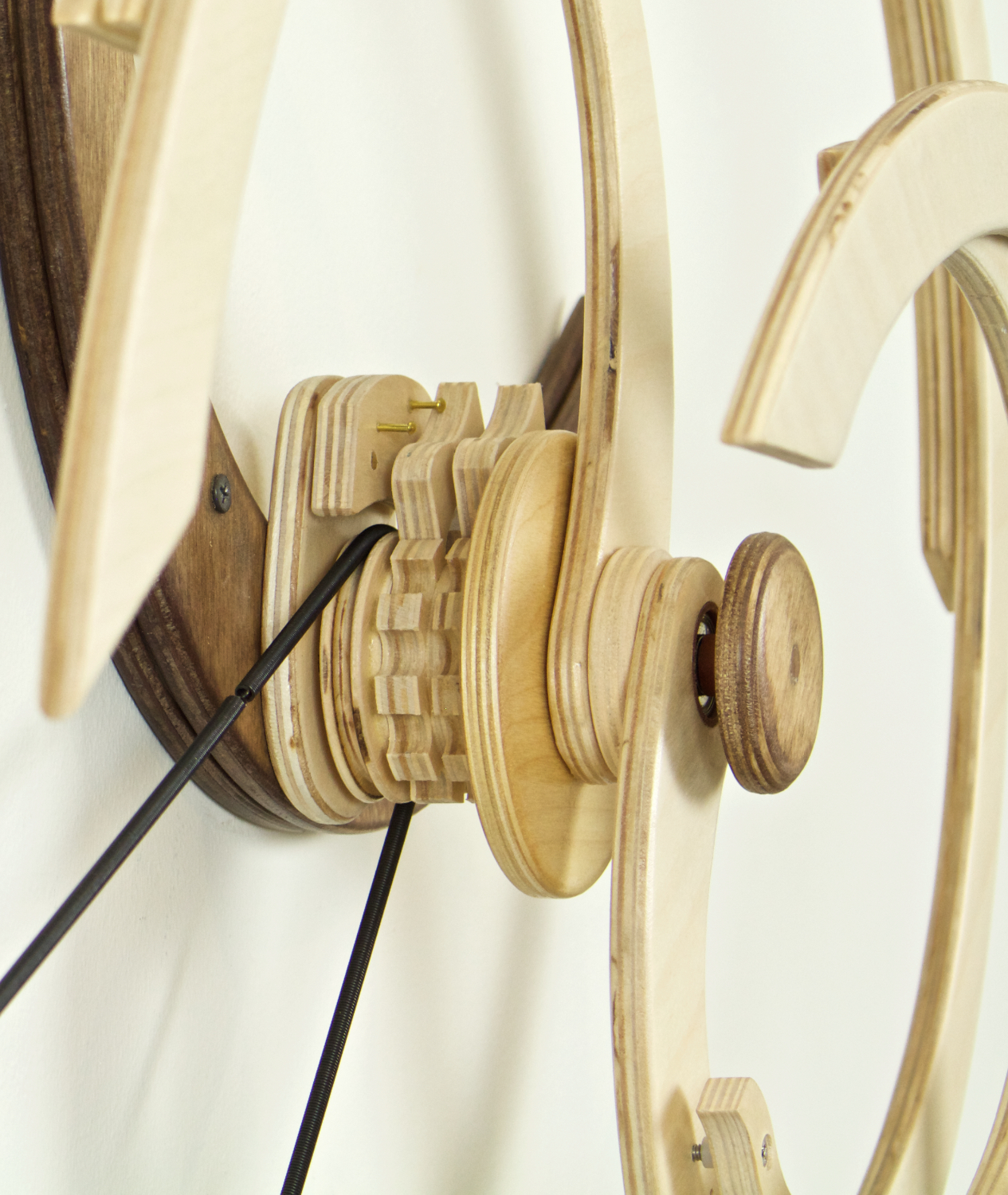 But there was still a problem. I made the first prototype and it worked as expected but it didn't excite me. I liked the flow of the carrying wheels but something about the overall feel was still wrong. I lived with the piece for more than a year, periodically sitting on my couch in the studio and studying. I finally realized what was bothering me. The straight line motion of the birds that I had carried forward from Solo wasn't right for a Duet. The birds seemed to fight each other rather than dance together. I redesigned the mechanism to produce spirals and swirls and rebuilt the prototype.